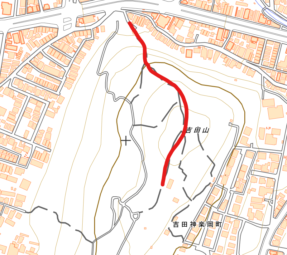 吉田山の面白さはこれに留まりません。洛外とはいえ京都の町、周囲には寺社仏閣やら天皇陵やらが多数存在します。また麓の建物も特徴的で、西部は京大をはじめとした文教地区特有の面影があったり、東部は大文字を間近に見られる景勝地として別荘などが建っていたりもします。地学的観点からは、ここから北へと走る花折断層による、北西部の急峻な斜面が特徴的でしょう。断層の影響で出来た山だとも言われています。