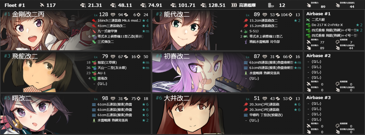 基地航空隊はXで話題になっていた陸偵(熟練)+重爆飛龍☆MAX×2に野中☆MAXを添えています。