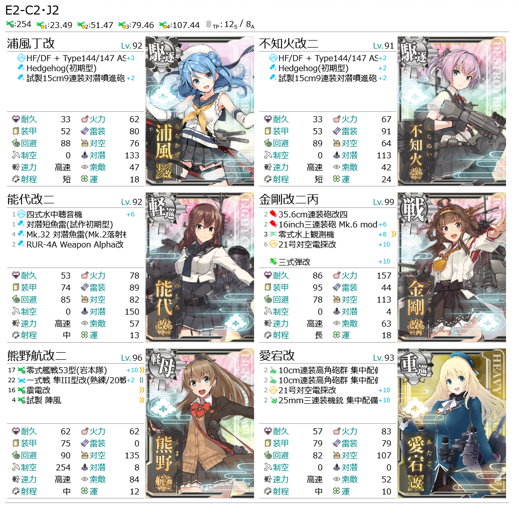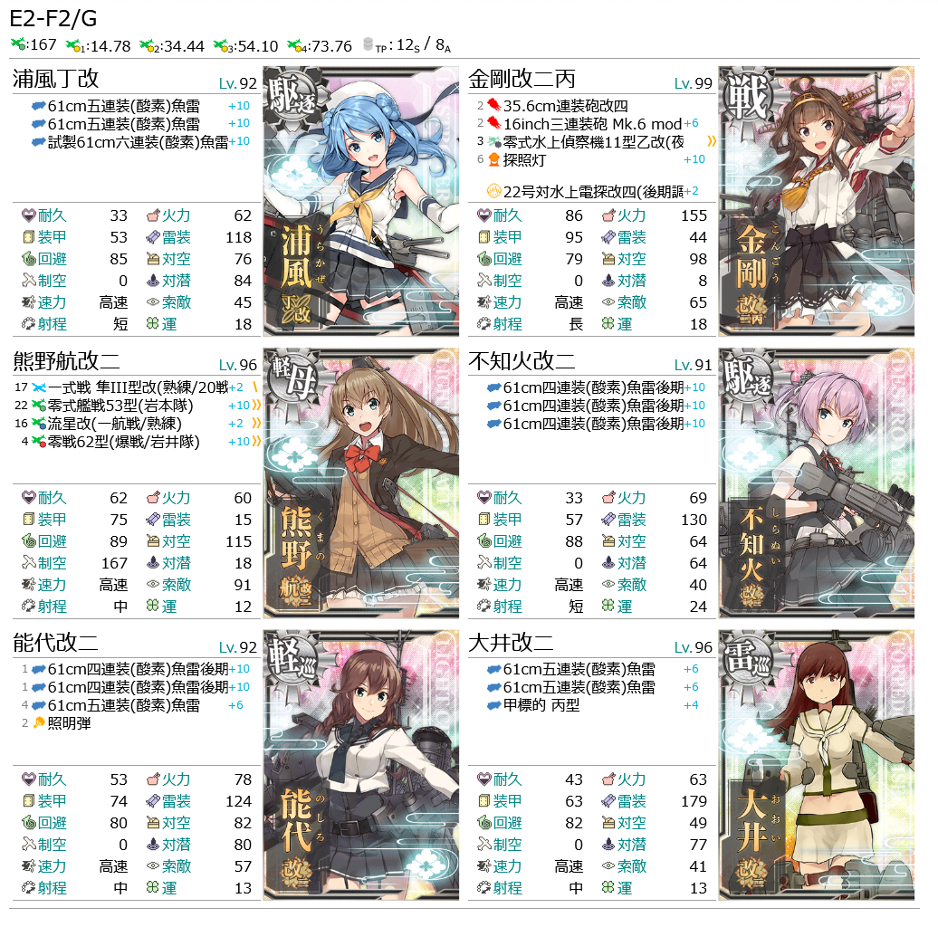 F2マスが大変です。E1-2ボスマスみたいな編成をしているのでE1-2ボスマスみたいに組むとよいでしょう。