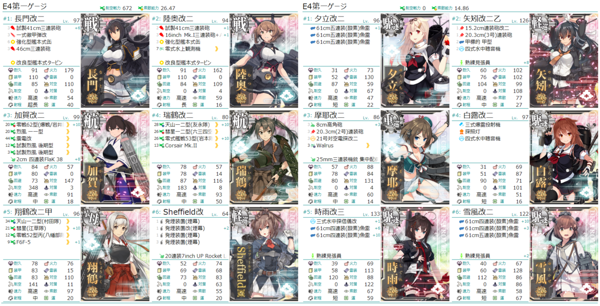 Cマスが鬼門。三重煙幕でも当たるときは当たります。大和武蔵が使えないので長門陸奥を高速化して採用。五航戦コンビに特効があるので制空の役割は加賀に集中させました。矢矧の1スロ先制対潜はラスダン時のみ。友軍もあり、ボスマスにたどり着けば勝てます(たどり着けるかはお祈りですが)。支援はラスダンのみ、お守りとして出しました。