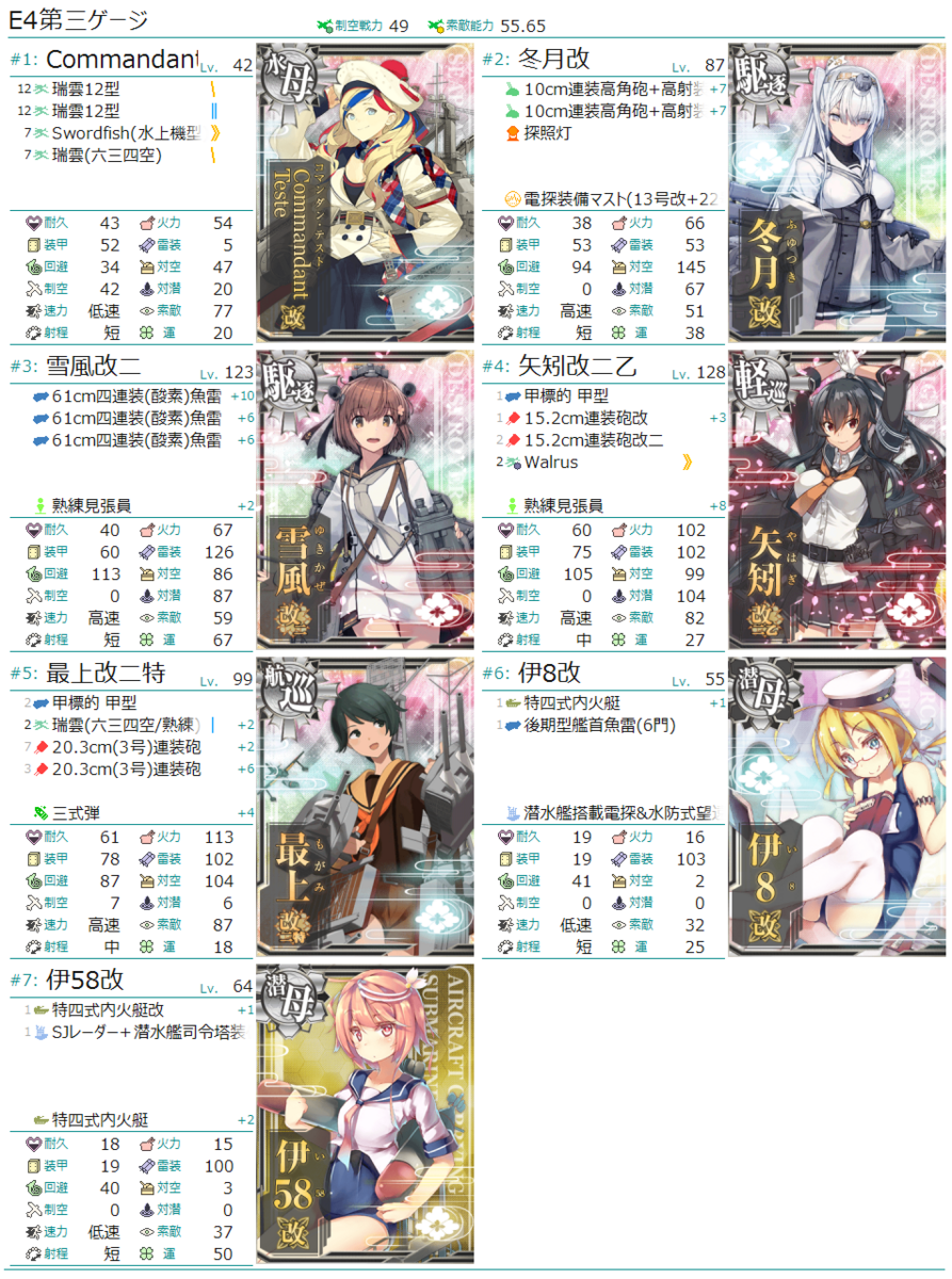 司令部なかったりその他戦力不足の部分が目立ったりしたので難易度落としました。潜水艦に穴あけて電探乗せると体感ですが楽になった気がします。実はこの編成、空襲マスに一旦逸れます。お祈りするしかないです。