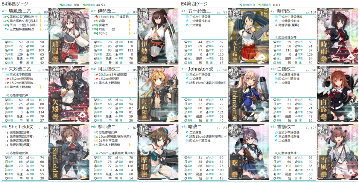 ボスマスにたどり着けば先制対潜だけで確実に旗艦を落とせます。ラスダンで道中撤退があったので一部の艦にお守りのダメコン積みました。